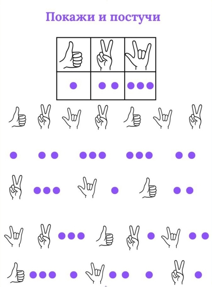 Ведущей рукой ( правша -правой, левша- левой) идем по схеме: где нарисована позиция пальцев - формируем туже позицию у себя на кисти, а там где точки - стучим той же рукой ровно столько раз, сколько точек видите.
